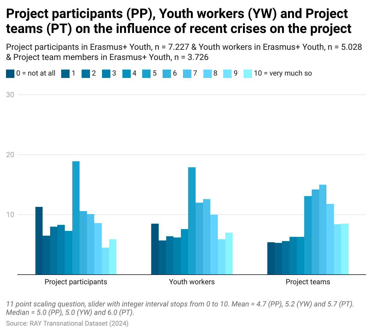 Project participants (PP), Youth workers (YW) and Project teams (PT) all agree that the influence of recent crises on the project was palpable. On an 11-point scale from 0 = not at all influential to 10 = very much influential, the means range from 4,7 (project participants) to 5,7 (project teams), with medians of 5 and 6 respectively.