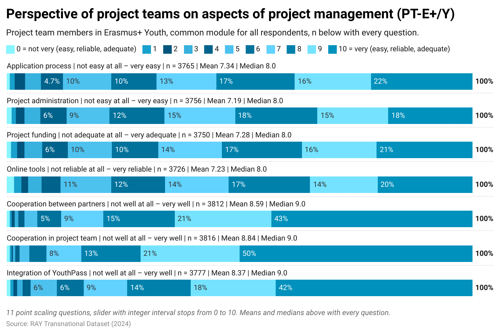Project teams are overall fairly satisfied with most aspects of project management in the Erasmus+ Youth Programme, but some aspects could do with improvements. For each aspect, project team members could respond using an 11-point scale from 0 = not at all easy/reliable/adequate to 10 = very easy/reliable/adequate.