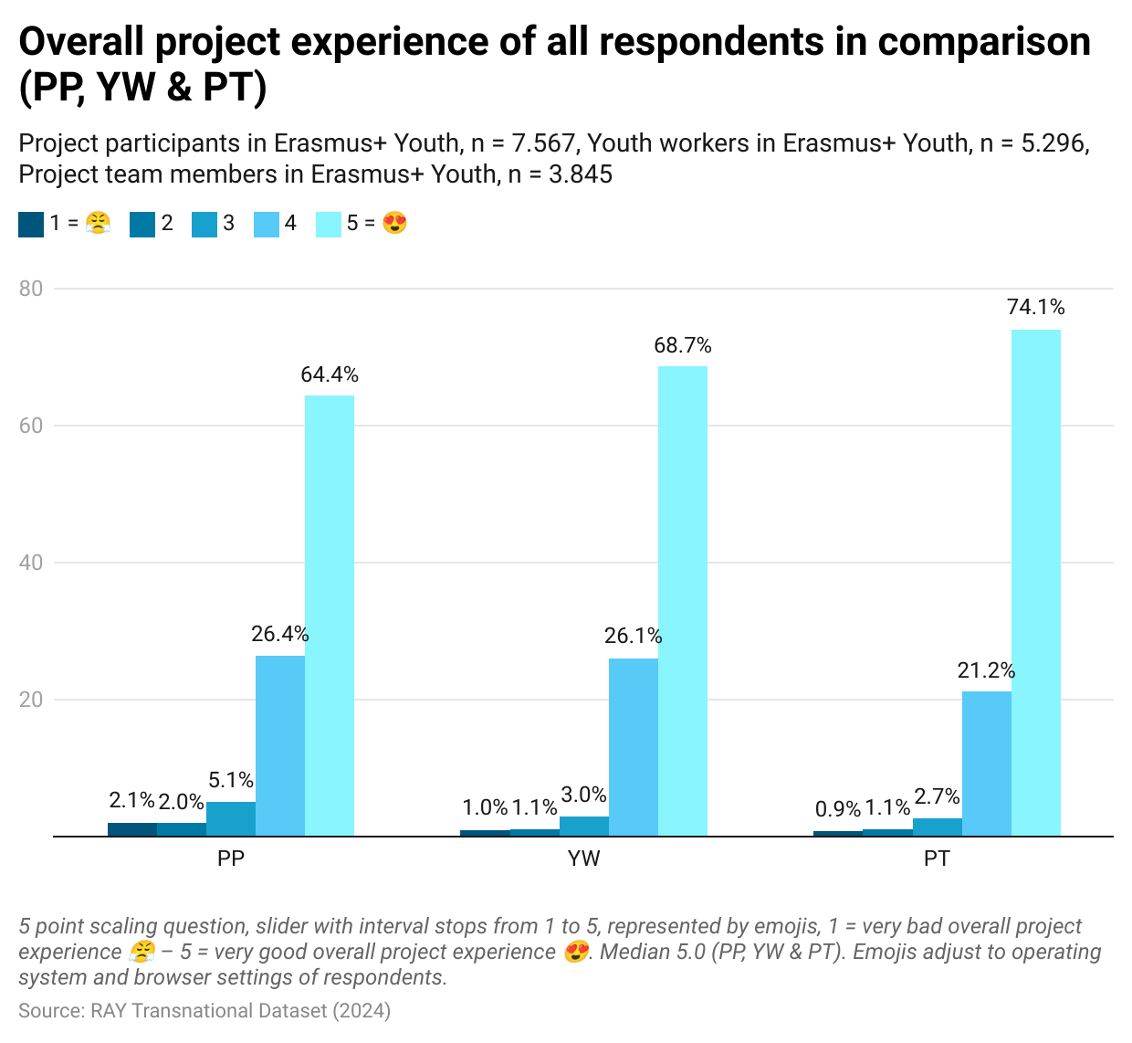 Despite the palpable influence of crises on the projects, the overall project experience in the European youth programmes remained very high. On a 5-point emoji scale from 1 = 😤 to 5 = 😍, the median of responses is 5.0, with 64% of project participants, 69% of youth workers, and 74% of project team members assessing their overall project experience with 5 = 😍.